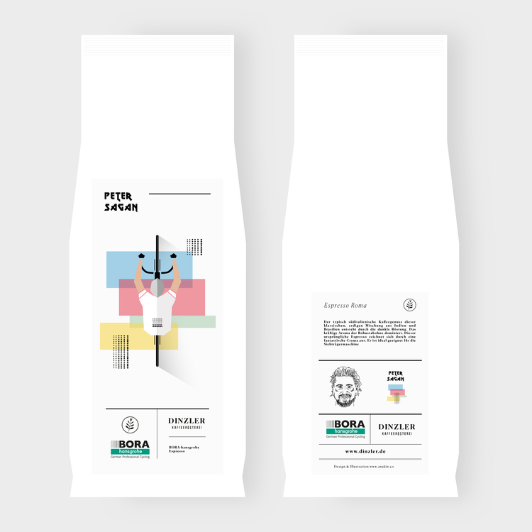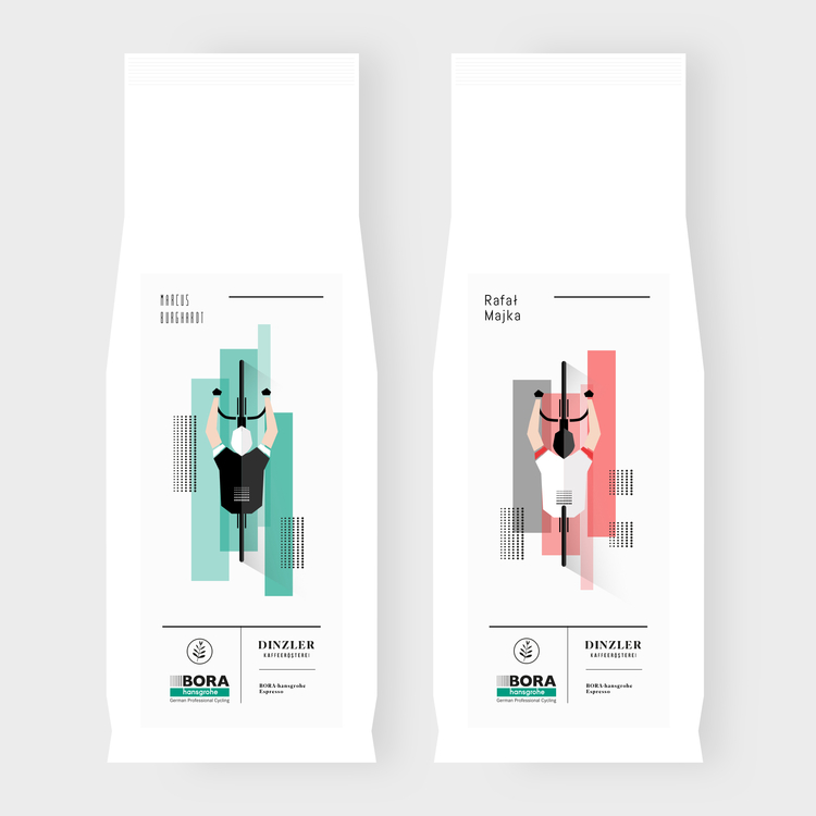 Die Dinzler Kaffeerösterei beauftragte uns Labels für eine limitierte Kaffee Edition für das BORA hansgrohe Rennradteam zu gestalten. Neben den Team Packungen entwickelten wir Signiture Labels für Peter Sagan, Marcus Burghardt und Rafat Majka.